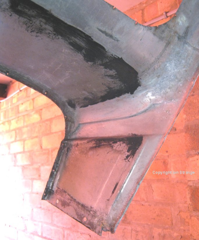 This is the earlier version of the scuttle panelling. The side panel was largely omitted when scuttle ventilators were added. You can see the 2 bolt holes for fixing the front wing to the wood frame. The black paint here is not original.