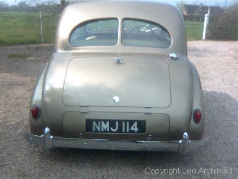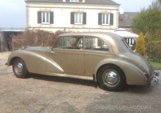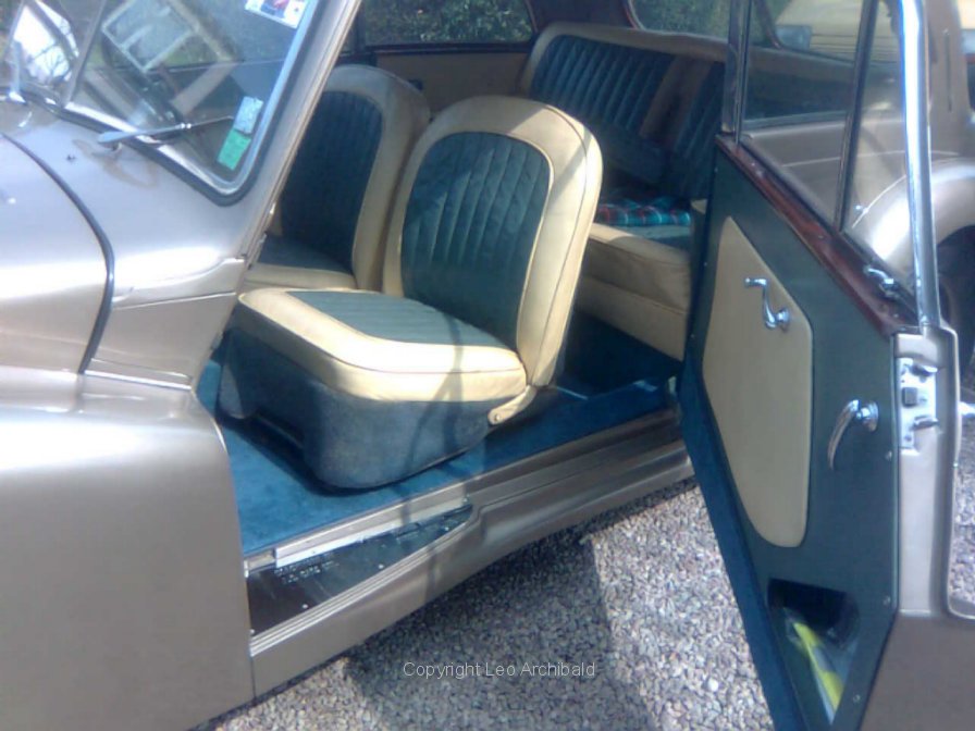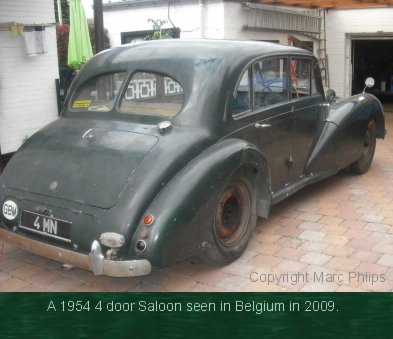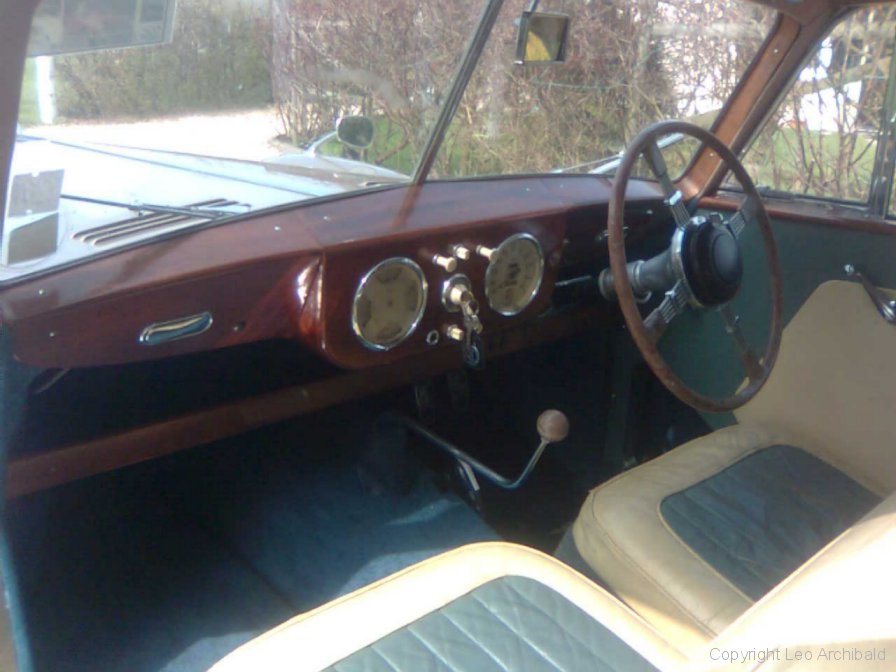 The 5 photos below are of a beautifully restored late model (1954) 2 door car. Note the later type of quarter-light windows, the distinctive upholstery design and colours, and the "beige fonce" (bronze) paintwork. These colours match AC's originals. The tail-lights appear to be the same as those used on the AC Aceca which was introduced that same year.