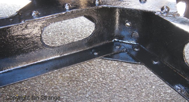 I resumed the restoration in April, beginning by repainting the central part of the chassis. Garage space limitations mean that I have to repaint one area at a time without stripping the entire chassis. Further to my comments above about Jotun's polyurethane paint finish, I tried out the thinners produced by the retailer SML Marine Paints. It did help to make it easier to apply, but the finish is still not in the same league as International Paints' version. Fortunately, the finish doesn't matter for most of this paintwork, since this will not be a show/concours car.
