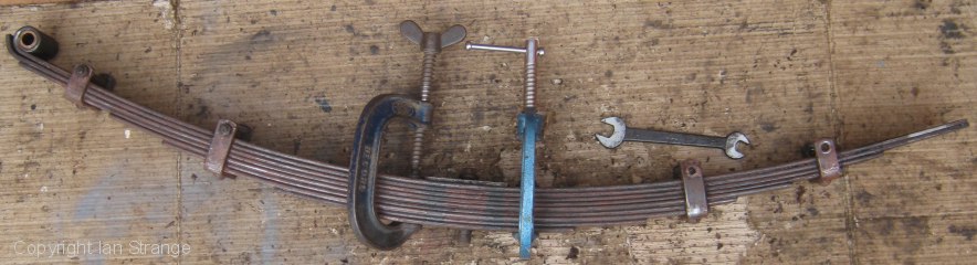 Apart from painting all the bits, I'm currently servicing the leaf-springs. These are most interesting items, featuring the same slipper type shackles also seen on some prewar SS (Jaguar) saloons. The slippers themselves appear to be made from graphite and are liberally lubricated with graphite grease. There was no measureable wear. The spring leaves were desperately in need of cleaning and re-greasing! Not much rust, but hardly any liquid lubricant to be found.