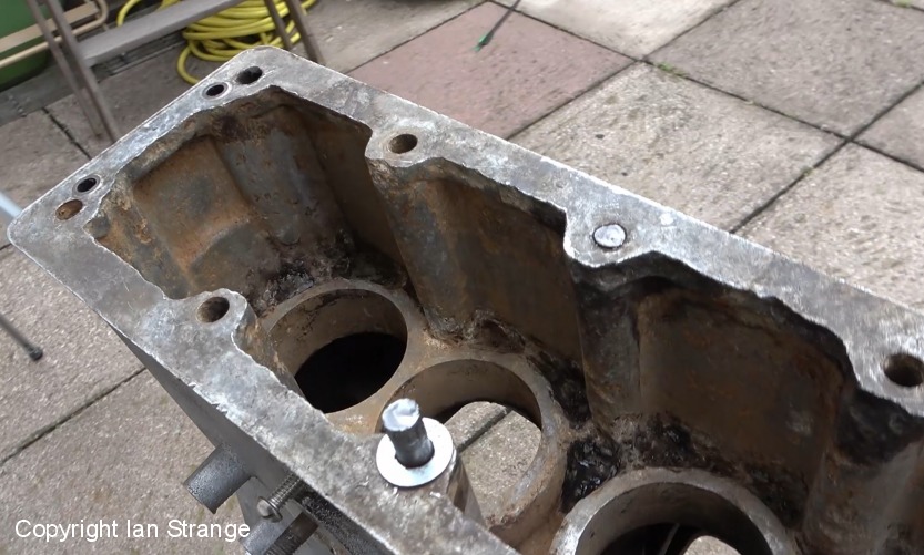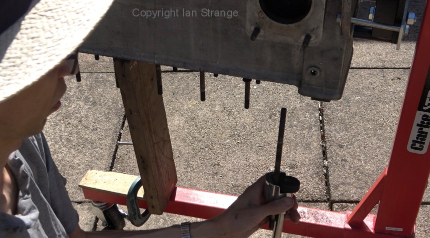 Then started the epic battle to remove the head studs. These go about 6.5 inches deep into the alloy block. I was apprehensive about heating the block too much, or too localised. Therefore, I contacted Brian Taylor's engineering company that has a lot of experience with AC engines. I was tempted to hand over the block for them to remove the studs, but they very kindly gave me lots of free advice. They also admitted that they don't relish the challenge of stud removal. At that stage, I had only removed 1 out the 14 studs. They recommended heating intensively around each stud with an O-A torch. Access to such a torch is not easy in an at home DIY situation, so I purchased a powerful blow-torch. Getting the block around each stud up to about 100 degrees C (212 F) was enough to remove most of the studs. The last few were very stubborn, and so I enlisted the help of AC engine specialist Leo Archibald. We removed the last few studs except for one that snapped flush! Oh no!