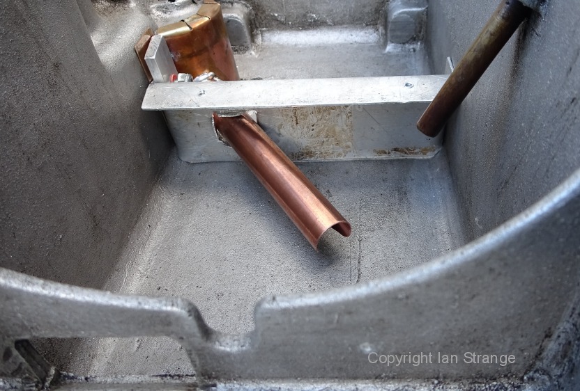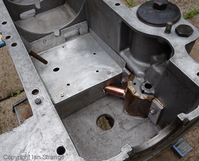 With no sign of the new crankshaft materialising, I decided to do some upgrades to the sump. I was largely following Leo Archibald's AC 2 Litre book. He used to race a 2 Litre special and has lots of experience of improving the engine. The oil pick-up in the sump is in the rear/right-hand corner, and there is only a limited amount of baffles to deal with surge. I made a copper screen to wrap around the oil-pump inlet gauze, and added a pipe to pick-up oil from near the centre. I added both vertical and horizontal baffles. The horizontal one probably needs more holes for oil flow, which I'll add later.