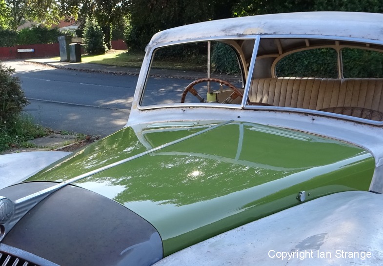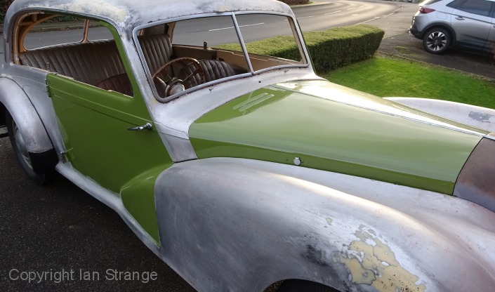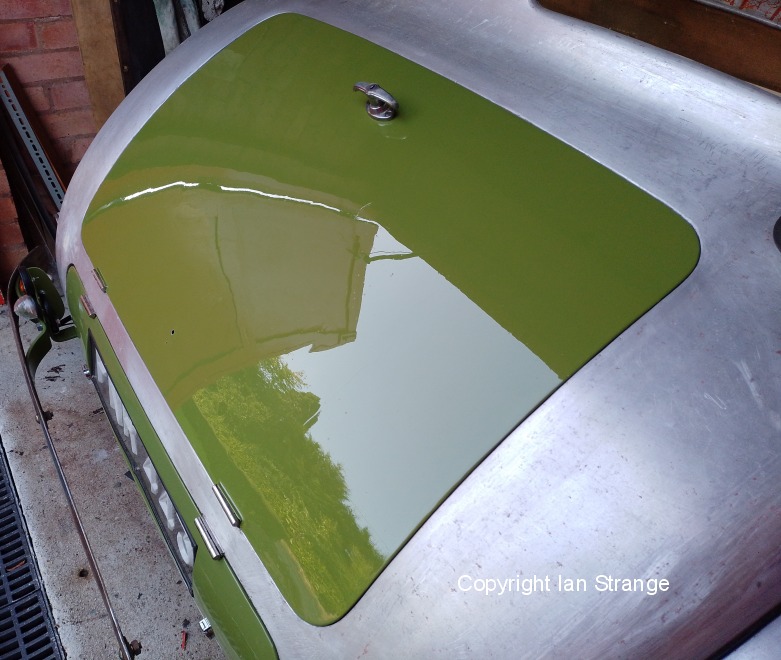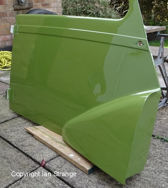 I then redid the clear coat on the boot-lid, and applied the green and clear coats on the driver's door and door surround. After a nice spell of early autumn weather, the wet weather arrived. I just had enough time to get the first coat of green onto the passenger door.