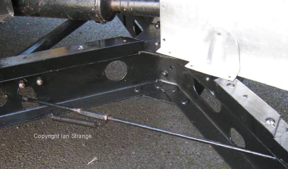 My brakes had been fitted with the wrong type of bias spring. The photo below shows the correct version. There is a choice of 2 pairs of mounting holes and I found that the more slack fitting was correct. The linings should touch the drums, and the pedal travel should be short. In the photo, you can also see a small spring on the leading shoe. There is supposed to be a cut in the lining, allowing the spring to raise that spot, to prevent the leading edge "picking up". Mine has been relined without the cut. I don't fancy cutting the asbestos myself! I'll leave it for now.
