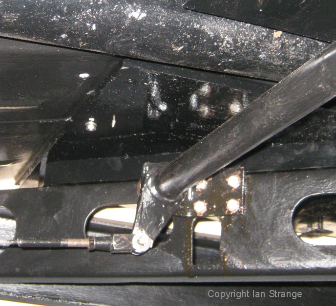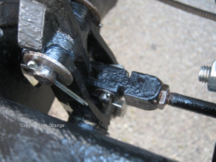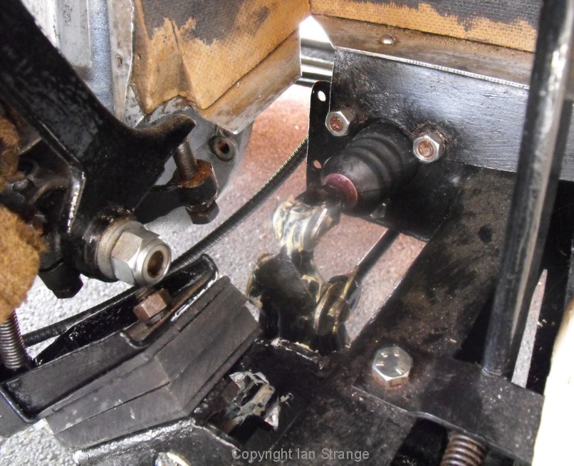 A close-up of the balance linkage, installed (that split-pin needs bending). The brake-rod extends to the front of the engine bay.
