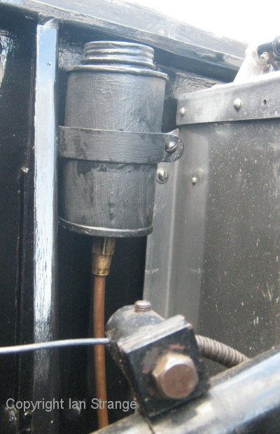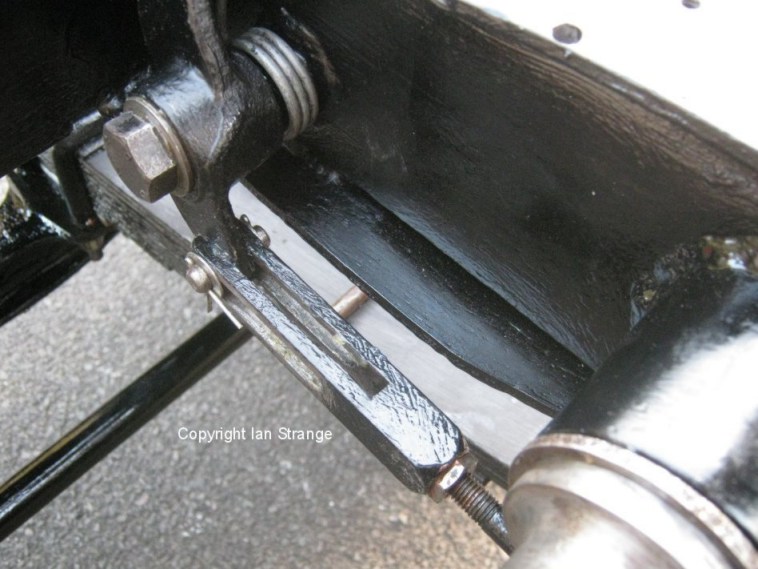 The next part to check is the large cross shaft under the centre of the car (see photo below). This has 2 arms coming down almost vertically. With all the brakes released, the clevis-pin centres should be 7/8" (22.2mm) behind the cross-shaft centre line. It's a bit awkward to measure. I parked the car on level ground, and made a plumb-line to sling over the cross-shaft. The shaft is 5/8" radius, so that the clevis-pin centre should be 1/4" behind the plumb-line. Adjustment is made with the barrel-nut under the driver's seat. Don't forget that one end has a left-hand thread, when you try to slacken the lock-nuts!