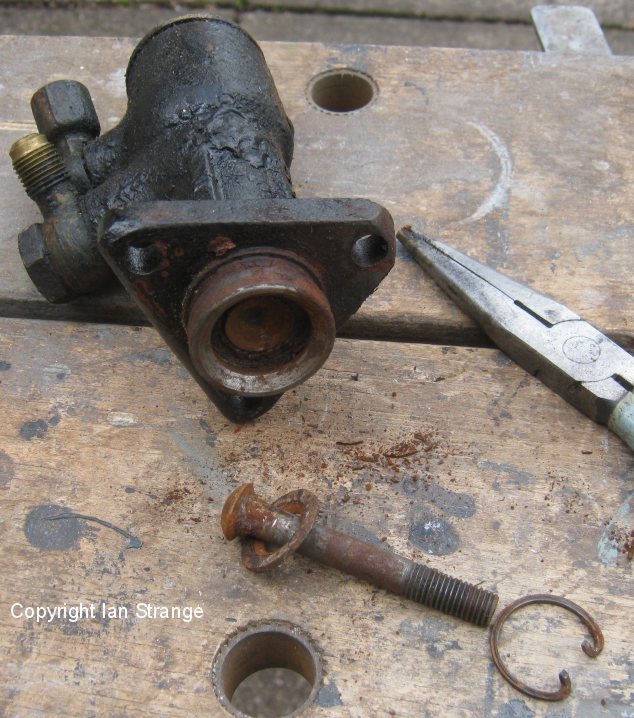 On mine, the rubber belows are a slack fit over the push-rod, allowing water in, hence the rust seen in the photo below (bellows removed). Removing the circlip, releases the push-rod assembly. This should also release the piston, unless it is seized. Soaking in penetrating oil, followed by some persuasion from a mallet, will usually free it.