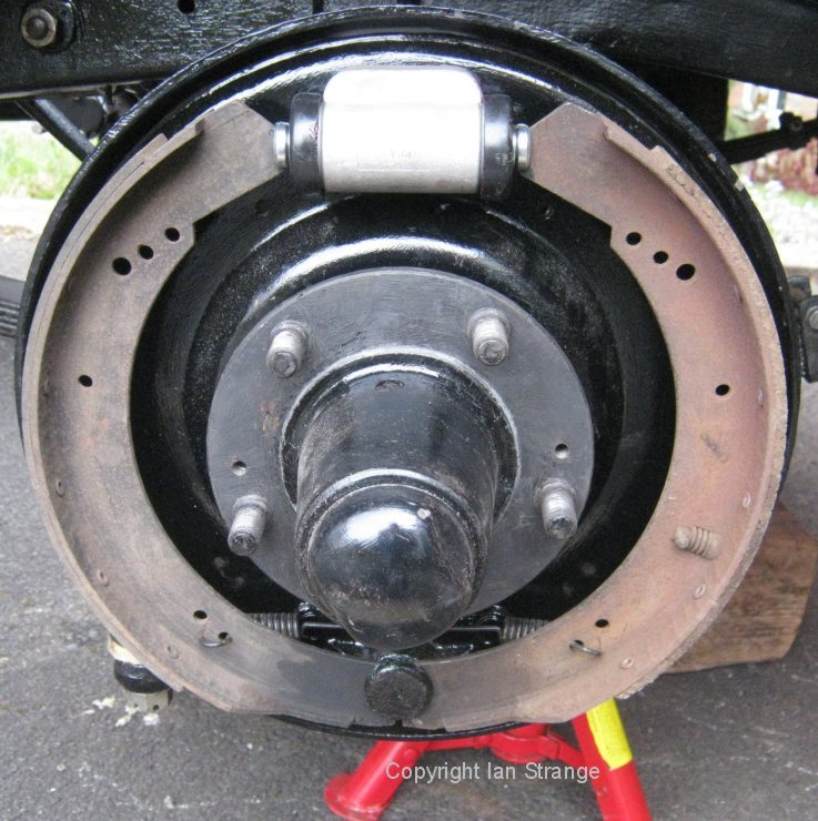 Disconnect the handbrake cable at the front of the engine bay. If you have the later twin-leading shoe front brakes (identified by the 2 cylinders on each brake), then lock up those brakes using the adjusters on the backplates.