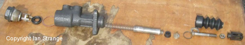 Clean parts thoroughly with brake cleaner (solvent). Install new rubbers, spring and copper washers. It might be worth annealing the copper washers, as it's hard to get a good seal (joints have to be very tight). Check that the joint surfaces are perfectly true. I found that the top surface where one of the pipe unions fits, was not quite flat. Also check that the end cap and its mating surface are perfect. I painted the master cylinder and reservoir with epxoy, as this resists brake fluid. I also painted the brake rods with epoxy, noting that one of them passes under the master cylinder.