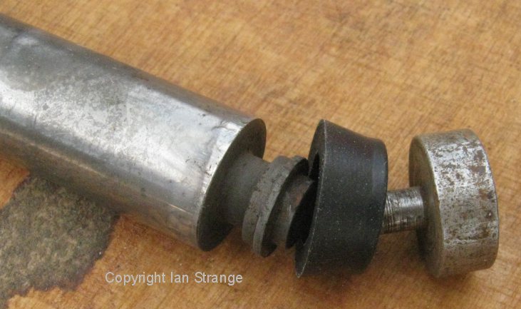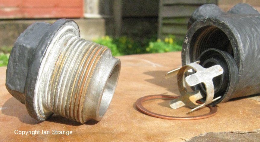 An odd quirk of this general type of cylinder, is that an air pocket can get trapped in the end cap. Fill the cap with brake fluid as you refit it. I installed the end cap assembly first, inserting a new recuperation seal into the body of the cylinder. Then insert the alumninium cage part way into the end cap, up to its seating and screw the end cap in (with new copper washer). From the other end, insert the spring and piston (with its new seal). Fit the little ball-socket piece to the end of the piston (some designs have this integral with the piston). Slide the heavy washer over the push-rod, smear the ball-joint with red rubber gease, and secure with the circlip. Pack more red rubber grease over this assembly, and into the new rubber bellows. With the bellows on, I added a washer to keep water and dirt from getting passed the push-rod. Other versions of this cylinder, have a collar on the rod for the bellows to locate on. Finally, the lock-nut and clevis yoke. I tightened up the end cap after fitting the cylinder to the chassis, so I could apply enough torque (I tried it at 90 ft-lbs).