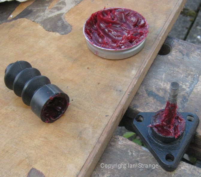 I dismantled the new wheel cylinders and packed the dust caps with red rubber grease. This is important, as any sticking, or partial seizure, plays havoc with hydrastatic brakes. They will drag if they don't operate freely. The red rubber grease keeps out dust and water.