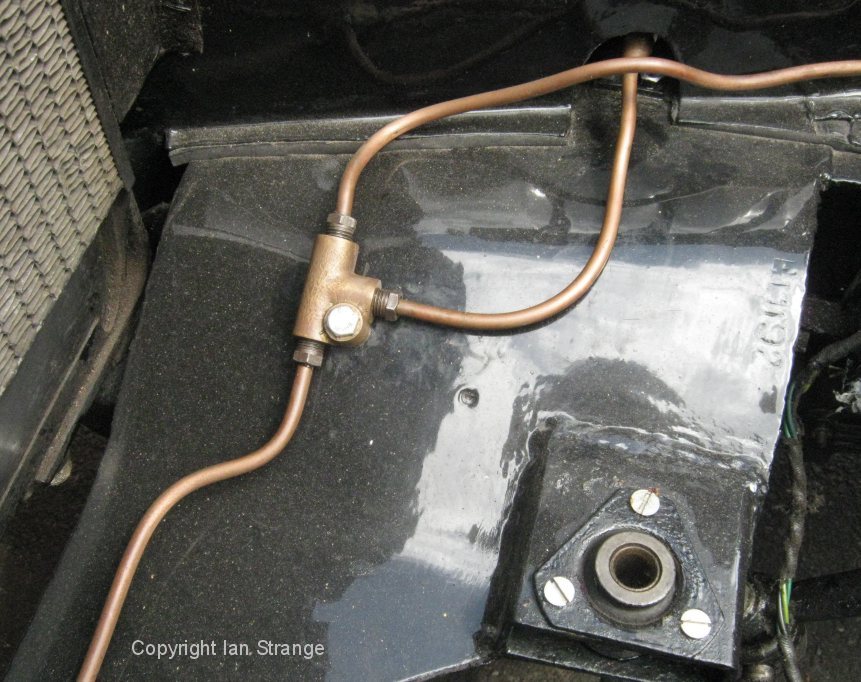 This is bolted to the chassis under the dynamo, and access is easier with the dynamo removed. It's held to the chassis with 3 bolts, 2 of which also help to secure the bulkhead. As always with hydraulic brake repairs, take care with the fluid, which is largely made of solvents. It will strip paint, and skin contact should be avoided.