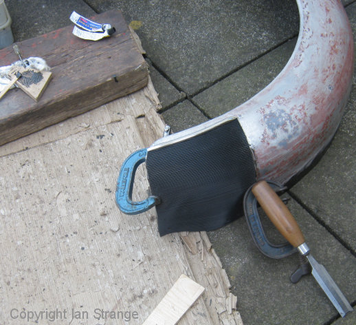 The rubber sheet is ribbed with a fine pitch. Sticking it onto the wing presents a problem, because its edges will wrinkle up on the wing's compound curvature. The stainless trim will clamp one edge down, then I stuck most of the rubber with a non-setting rubber sealant. Finally, I epoxy glued (quick setting) the edges, compressing the rubber by hand and a set of small clamps. My clamps couldn't reach all areas, so I improvised when getting the last few stubborn wrinkles flattened out. Note that the rubber matting extends into the wing/body join. Along that hidden edge, I cut a couple of triangular sections out, to reduce the tendency to crease.