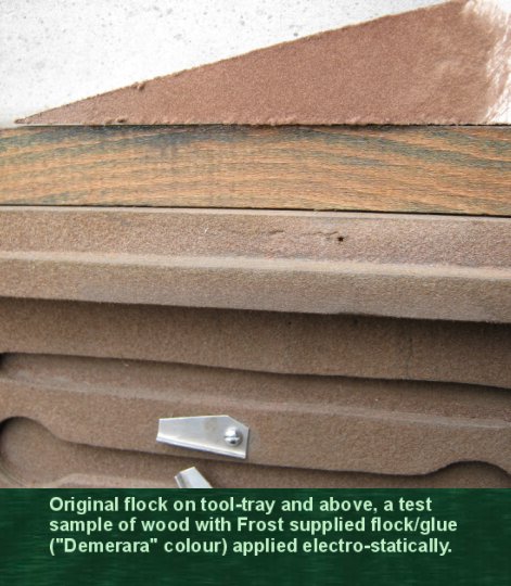 As flock spraying is an industrial process, the cost of conventional electro-static sprayers can be prohibitive. However, I did come across a seller on ebay in the UK marketing his own less expensive version (called FlockTech) developed for model railway grass scenery production. I used the same Frost flock and adhesive and had good results at my first attempt.