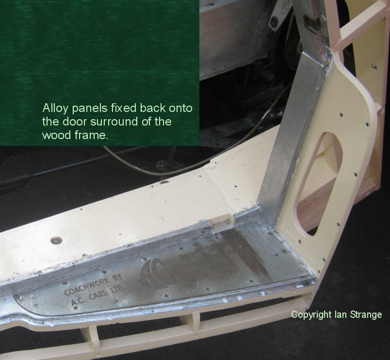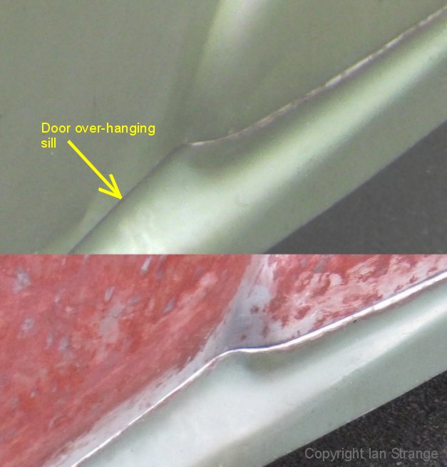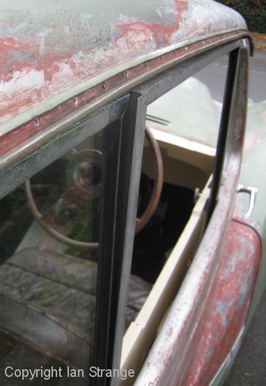 Another alignment problem concerns the window frames, and this seems to affect a few ACs. The top rear corner of the door window frame, does not align with the rear/side window frame, leaving a gap under its flange. This is due to the door window being vertical, and the rear/side window sloping slightly. I'll go into more detail about doors in due course, in the restoration section. The passenger door looks to be in better condition... I hope!