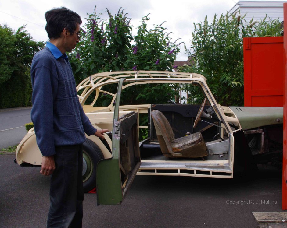 On the 17th August, the bodyshell was lifted out of the garage and onto the wood frame, 24 years after being removed. After a bit of persuasion, it all still fits, and far fewer panel creases than I had feared. I had altered one of the screen pillars on the wood frame for a better door fit, and this meant also changing the fold-line on the panelling.