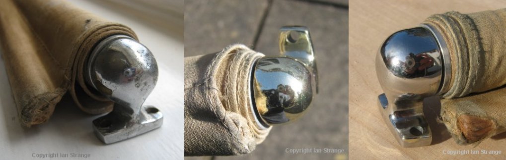 Above is shown one of the quarter-light window knobs. Prior to replating, the nickel under the chrome was pitted giving a rough feel. The middle photo shows it after sanding and rough polishing, revealing the yellow-ish nickel plate. On the right is the finished item with replica-chrome applied.