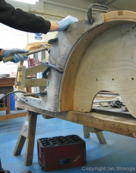 I was also able to watch closely as one of Morgan's craftsmen folded and fastened aluminium panelling to a wood frame. The above photo shows a side panel clamped under plywood while the edges are hammered over.