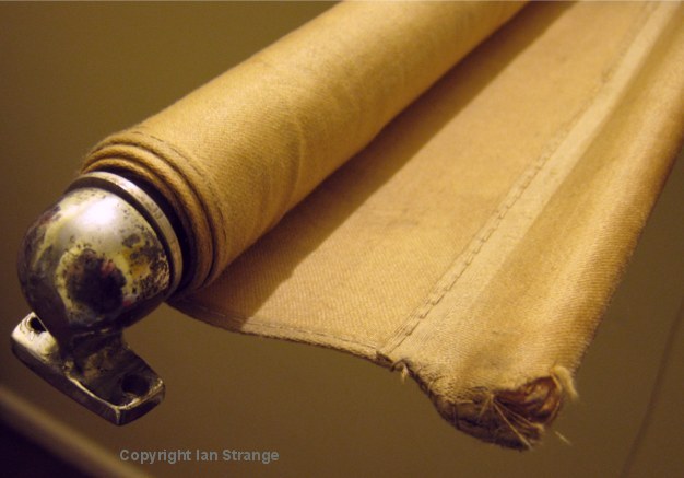 ACs were fitted with this roller-blind inside the rear window. It is operated via a length of string passing through a system of tiny pulleys and then through eye-screws above the driver's side window. The end of the string has a plastic ring on it which hooks over a stud above the driver's door to keep the blind closed. The photo shows one of the brass support brackets, the rolled up blind itself, and the wooden batten at its top edge. The old cloth colour has faded badly.