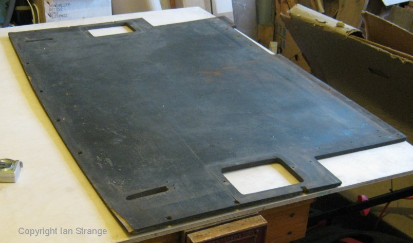 The original boot floor 5-ply panel (3/8" thick), being used as a pattern to produce a replacement.