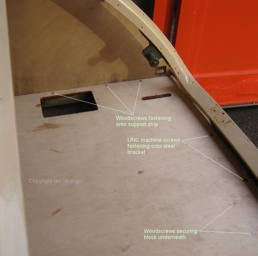 A new boot floor panel being test fitted with the fixing screws labelled.