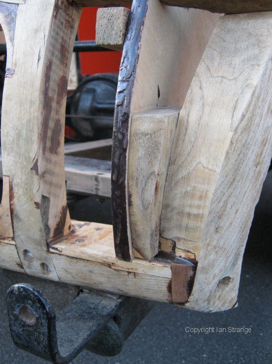 Assembled rear corner of wood frame. The pale cream coloured sections of wood are repairs.