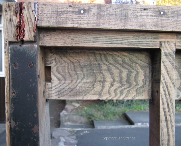 The top of the right-hand door-hinge pillar and window rail, viewed from inside the car. The steel reinforcement bracket is evident in this view. The slot in the pillar is plugged at the top by a slither of wood, and I had sealed it in with the reddish-brown glue seen at the top of the pillar. The rectangular cut-out in the side rail, is for a door-hinge bolt and nut.
