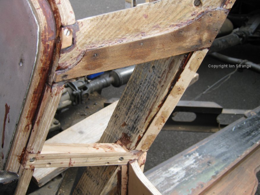 A close up of the left-hand side of the scuttle area showing joints with the screen pillar. There is a thin piece of plywood on the outer edge of the screen pillar. Another piece of plywood forms the decorative bodyside moulding. This photo is from an earlier AC not fitted with scuttle ventilators. For those ACs with ventilators, there will be detail differences.