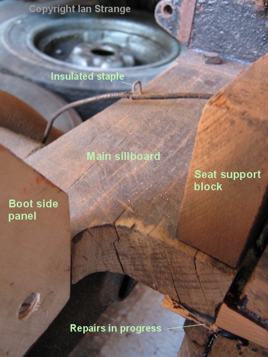 This view of the right-hand main sillboard, shows some slight splits caused by overloading. When the boot framework rots away, loads are transferred to the side frames and onto the sillboards.